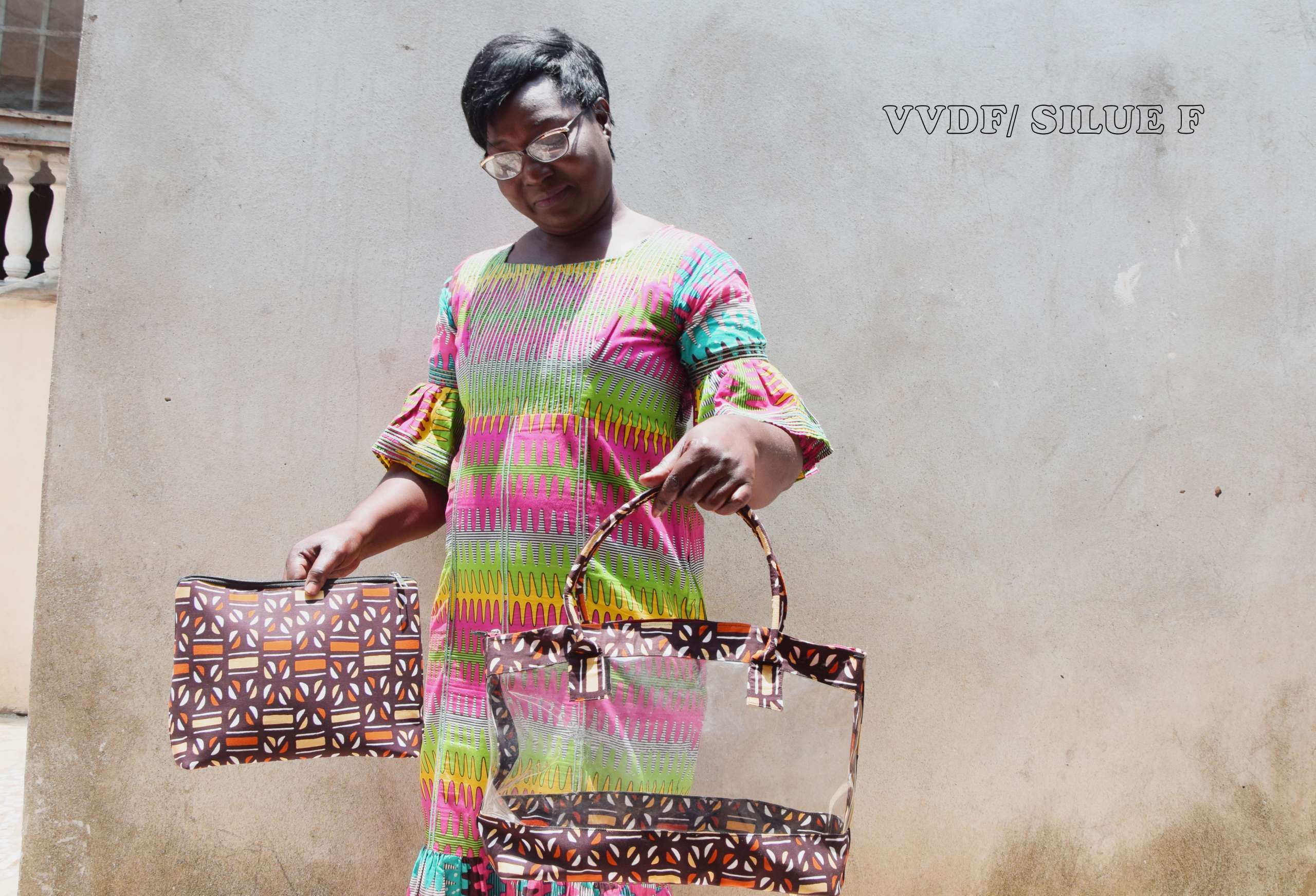 Niamba Valérie, la cinquantaine révolue, privilégie le mélange du pagne et du jean. Elle en fait des robes, des chemises, des chaussures, des sacs, des pochettes, des colliers, des bracelets, des écharpes, des éventails… elle ajoute parfois les fils de nattes, des cauris surtout aux bracelets.