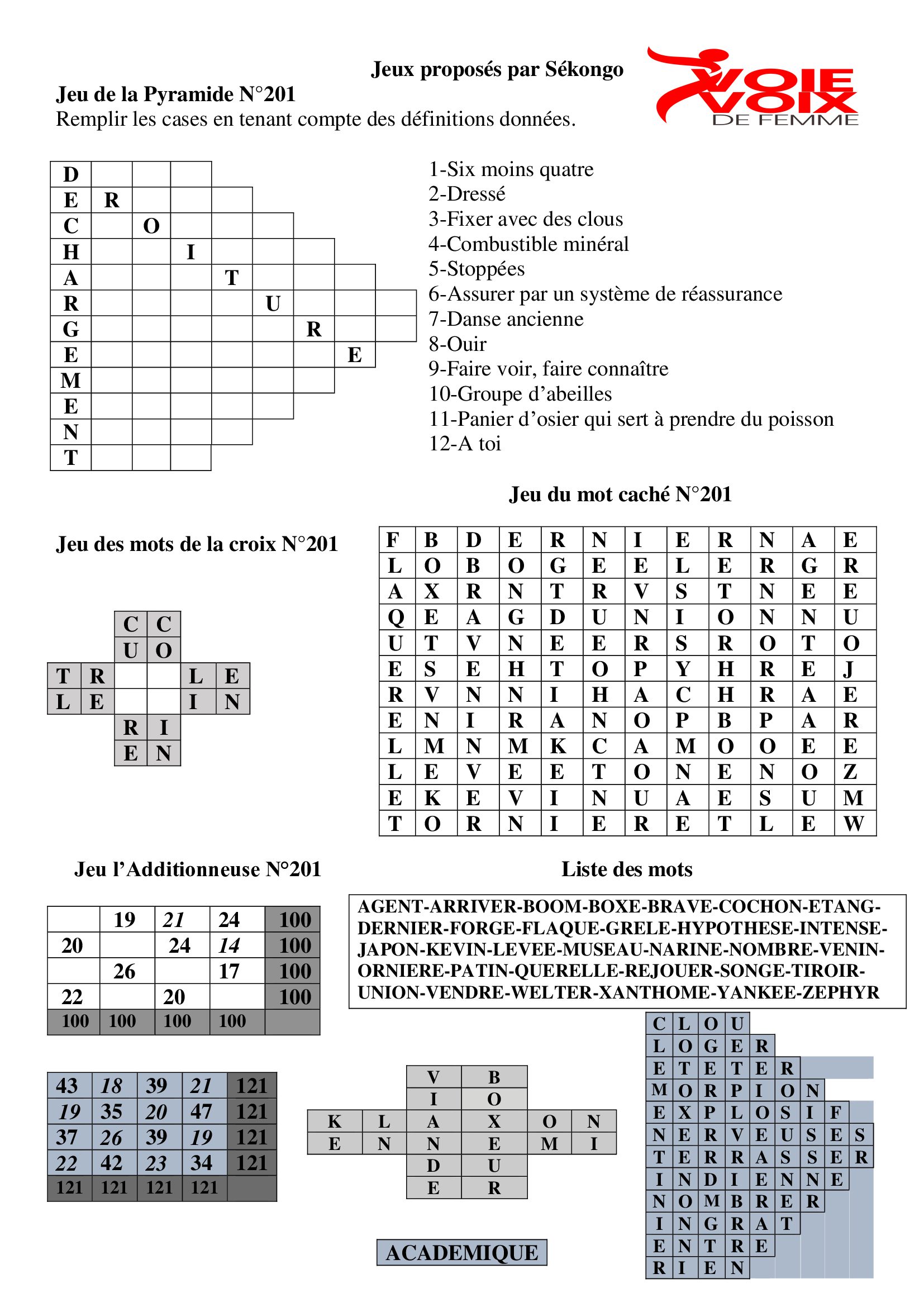 http://voiedefemme.net vous propose les jeux de Sékongo : Jeu de la Pyramide- Jeu du mot caché…